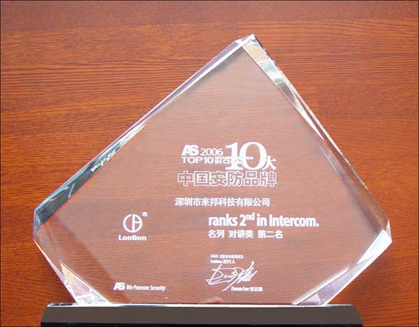 以下是2006度被评为中国安防行业十大品牌荣誉奖牌: