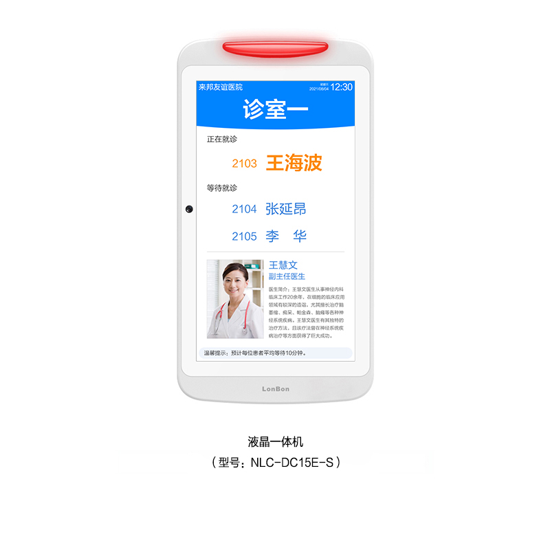 •  • 采用15.6英寸液晶显示屏,内置灯带双侧发光设计,壁挂式安装在诊室门口。