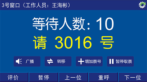 • 2. 可按“暂停”、“上一位”、“下一位”、“重呼”按键叫号,支持手动转移呼叫