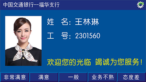评价显示:可液晶显示工作人员姓名、照片、服务评价操作提示。