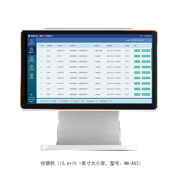 • 采用15.6英寸单屏设计,具有现场购物、结算、送货管理、商品管理、订单查询、查看统计报表。