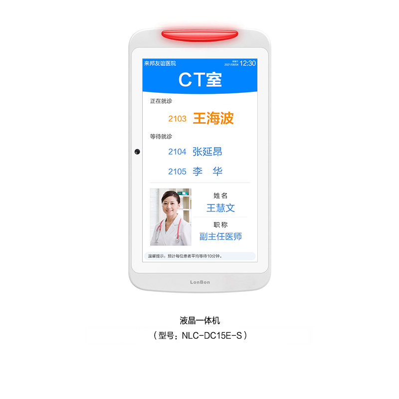 •  • 采用15.6英寸液晶显示屏,内置灯带双侧发光设计,壁挂式安装在体检室门口。