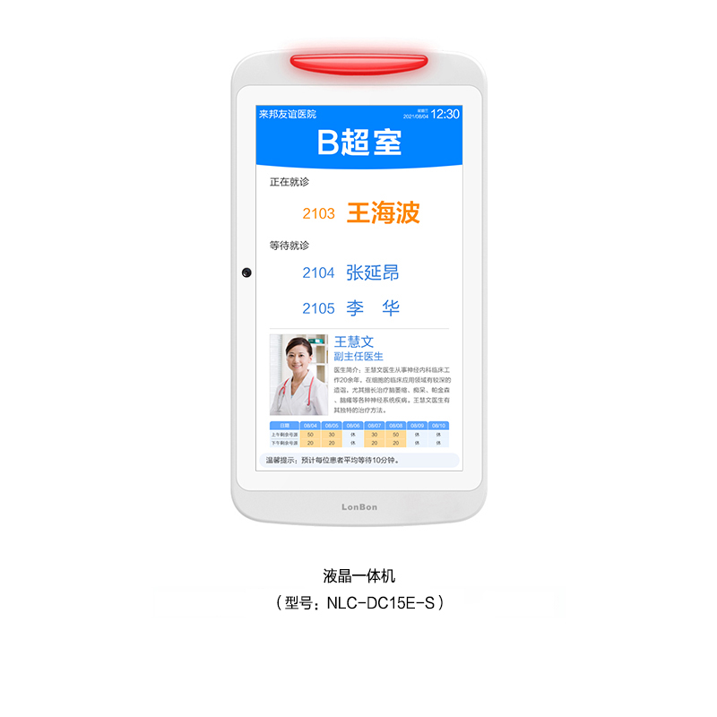 • 采用15.6英寸液晶显示屏,内置灯带双侧发光设计,壁挂式安装在检查室门口。