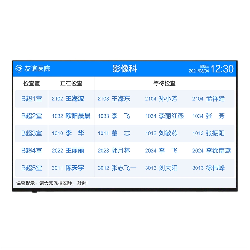 • 采用65英寸高清液晶显示屏,壁挂或吊装(支架需另购)在等候区。