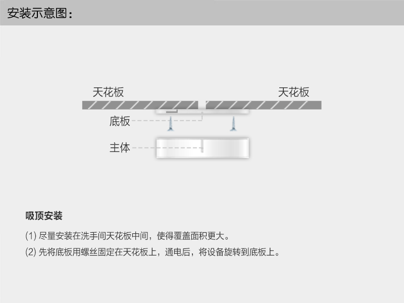 • 安装在洗手间天花板。采用4G Cat.1通信技术,利用运营商基站网络传输,出厂内置通信卡、即买即用,IP67防水设计。